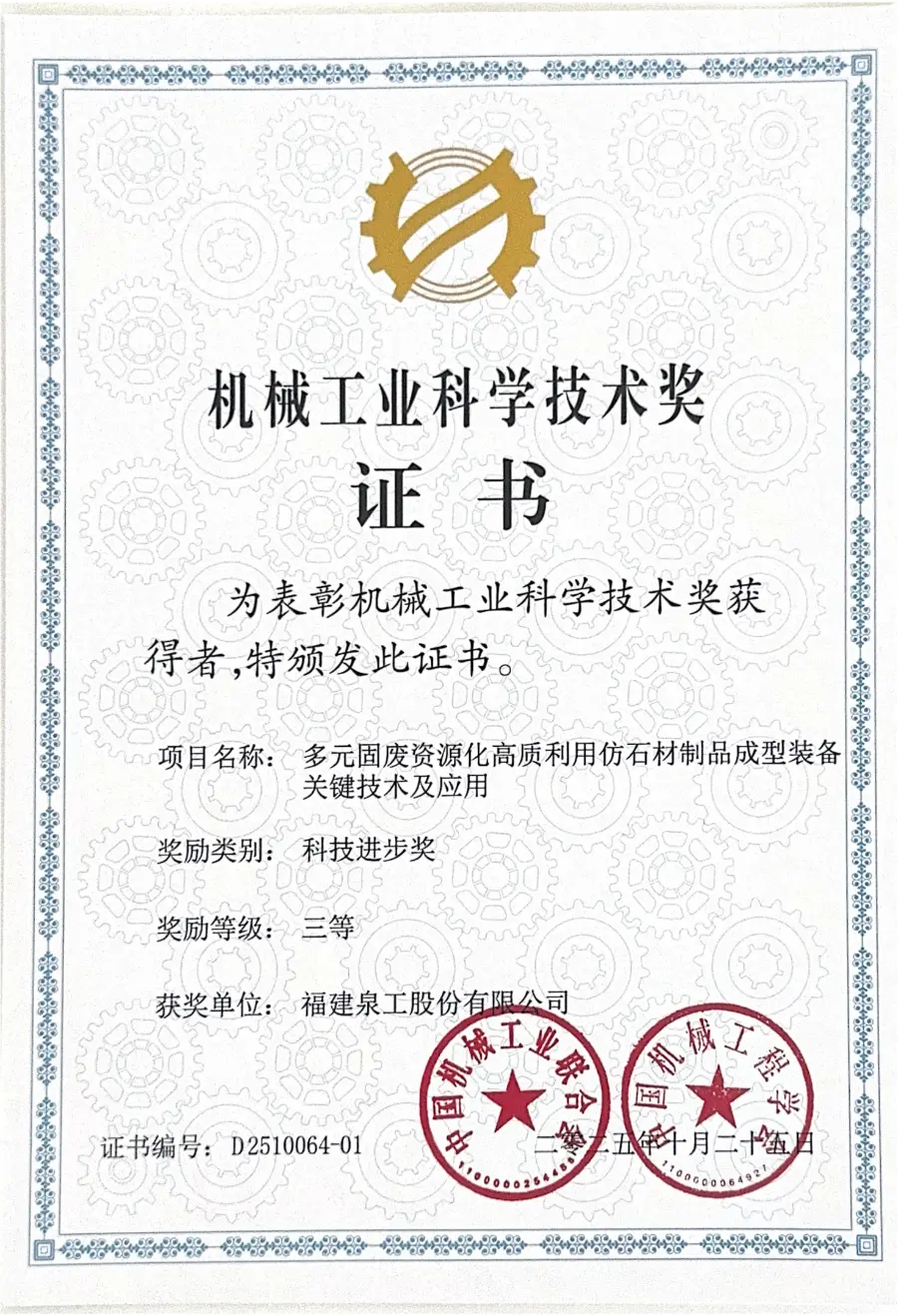 Memperkasakan penggunaan sisa pepejal yang bernilai tinggi melalui teknologi: Quangong Machinery Co., Ltd. memenangi Hadiah Ketiga Anugerah Kemajuan Sains dan Teknologi Industri Jentera China.